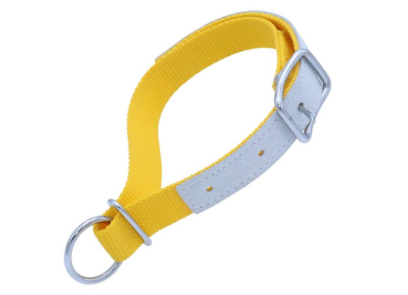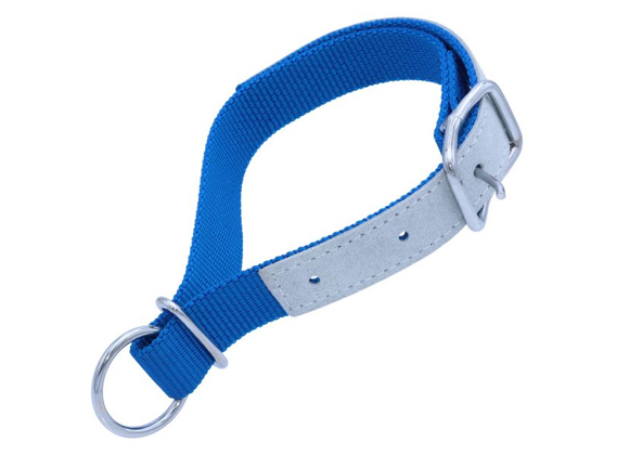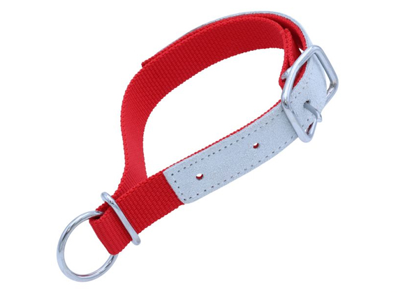 Nylonhalsbånd med læderforstærkning og metalspænde.